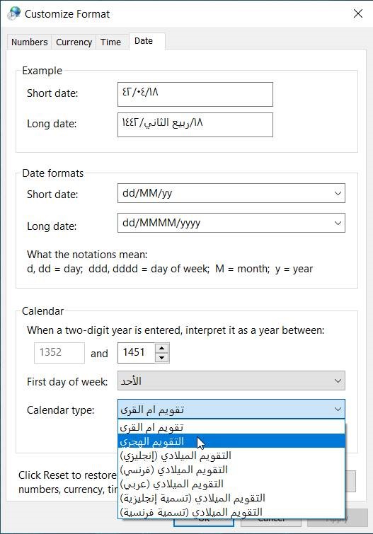 Stellen Sie sicher, dass als Standardkalender der Hijri-Kalender und nicht der Um-al-Qura-Kalender ausgewählt ist: