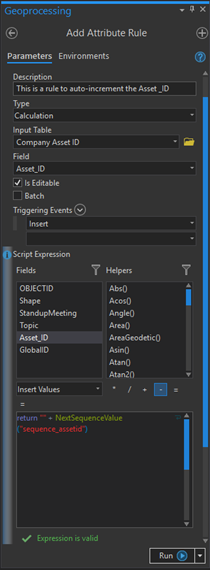 此工作流将使用两个地理处理工具来配置数据库序列,该序列从预定义值开始并自动递增,然后使用 Arcade 表达式将属性规则添加到要素类或表中,以在所需字段中使用此序列。- 配置数据库序列