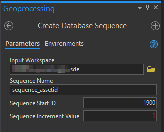 - 在创建数据库序列地理处理工具中,在输入工作空间中选择所需企业级数据库,为序列名称提供名称,为序列起始 ID 提供数值,并提供序列增量值