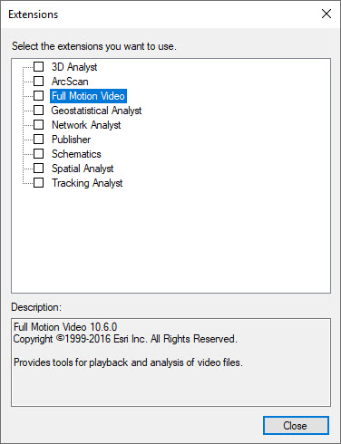 从 My Esri 下载 Full Motion Video 加载项并运行后,ArcGIS Full Motion Video 加载项未显示在要在 ArcMap 中启用的扩展模块列表中。